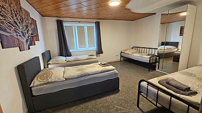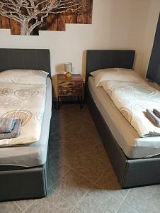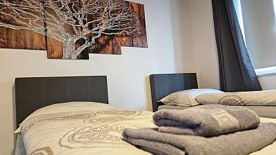 Im Apartment befinden sich 2 Boxspringbetten (90 x 200 cm), welche zusammengeschoben ein Kingsizebett von 180 x 200 cm ergibt ohne "Besucherritze) sowie 2 stabile Gästebetten (90 x 200 cm) aus Metall.