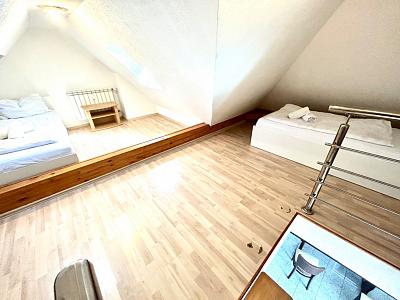 Vier -Zimmer-Wohnung für 8 Personen. Kostenlose Parkplätze auf dem Grundstück , free Wlan und eigene Einbauküche, Bad/Dusch/WC, Waschmaschine, Trockner, Dachterrasse, sind vorhanden. Frische Bettwäsche, Handtücher und Badetücher und Hygieneartikel werden kostenlos zur Verfügung gestellt. Einkaufscentrum, Fussgängerzone und ZOB in wenigen Gehminuten erreichbar.