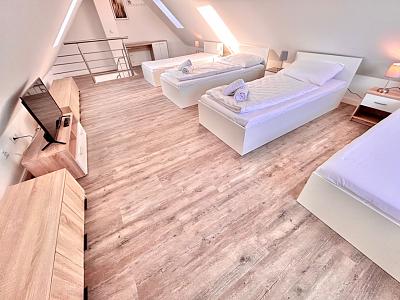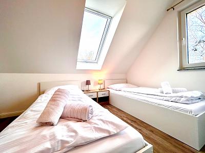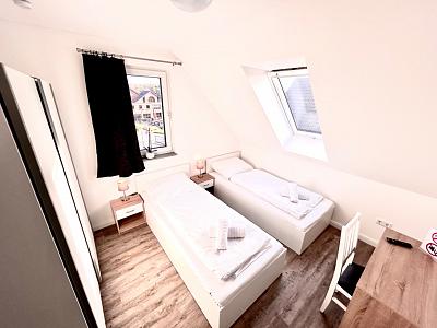 Diese Vier-Zimmer- Maisonette-Wohnung ist ideal für große Gruppen bis zu 9 Personen. Bettwäsche und Handtücher werden zur Verfügung gestellt. Kostenlose Parkplätze auf dem Grundstück können genutzt werden. Die Wohnung ist mit neuen Möbeln und einer Fußbodenheizung ausgestattet. In der Nähe gibt es viele Einkaufsmöglichkeiten sowie den ZOB. Im Waschkeller stehen mehrere Waschmaschinen und Trockner zur Verfügung. Wlan kann kostenlos genutzt werden.
