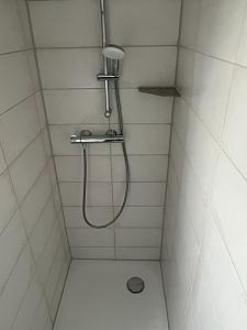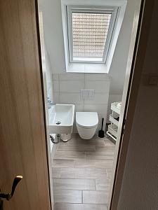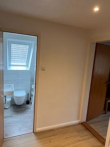 Das Badezimmer ist mit Dusche und WC.