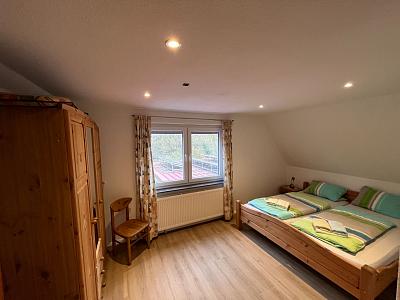 Das Schlafzimmer ist mit einem Doppelbett, Kleiderschrank und einem Sofa ausgestattet.