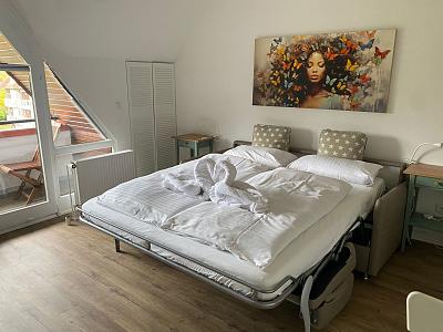 1 Zimmer Apartment für 1-2 Personen, Nichtraucher, Wohn-/Schlafzimmer mit Schlafcouch, Küche, Duschbad, Loggia, Parkplatz, Fahrstuhl, 4. Etage, WLAN. Gemeinschafts-, Schwimmbad, Sauna u. Dachterrasse, nicht behindertengerecht.