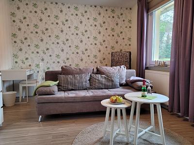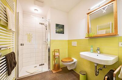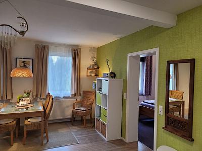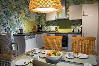 Eine Ferienwohnung voller Harmonie, praktisch aufgeteilt für zwei Personen: Ein kleines gemütliches Schlafzimmer, ein modernes Bad mit Bambus-Elementen und einer großzügigen Echtglasdusche, eine moderne Küchenzeile, ausgestattet mit allem, was man zum Kochen braucht, dazu ein Essplatz mit Blick ins Grüne sowie ein separates Wohnzimmer mit einer Couch zum Entspannen, Flachbild-TV und einer kleinen Leseecke zum Schmökern Ihrer Urlaubslektüre.