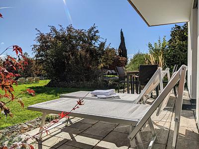 Terrasse: Auf der großen Terrasse haben Sie eine traumhafte Aussicht auf den Garten und den Pool. Genießen Sie die Sonne auf der Sonnenliege oder nutzen Sie die Sitzgruppe für eine Mahlzeit im Freien.