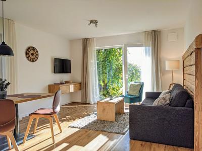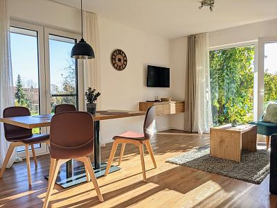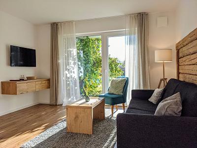 Unsere beliebte Landsuite Heiligenberg befindet sich im Erdgeschoss und bietet auf 67 qm bis zu 5 Personen reichlich Platz.