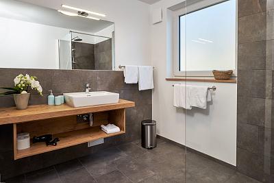 Bad: Im modernen, großzügigen Badezimmer mit viel Tageslicht befindet sich eine schwellenlose, ebenerdige Dusche, ein WC und ein Waschbecken.