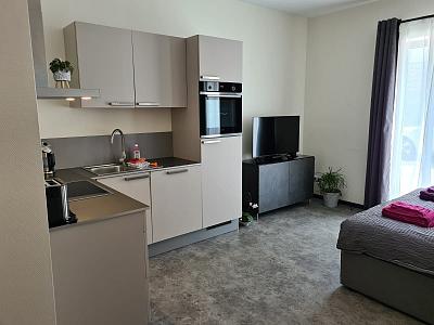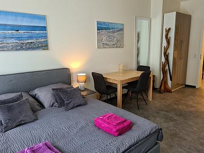 gemütlicher Wohn-/Schlafraum, Esstisch und Flachbildfernseher sowie eine volleingerichtete Küchenzeile mit Toaster, Kaffeemaschine, Wasserkocher, ein Herd mit 4 Cerankochplatten und Backofen, Kühlschrank mit Eisfach, Geschirrspüler, diversen Küchenutensilien und Mikrowelle;