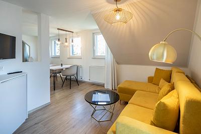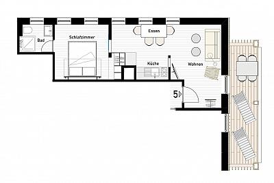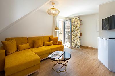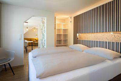 Im gemütlichen Schlafzimmer mit eigenem Balkon finden Sie ein komfortables Boxspringbett (160x200) sowie adäquate Staumöglichkeiten. Besondere und nachhaltige Materialien verschönern Ihren Schlaf und lassen Sie geborgen fühlen.