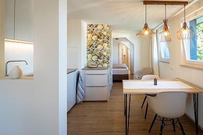 Auch im Wohn- und Essbereich haben wir sehr viel Wert auf klare Linien und Farbgebung als auch auf hochwertige und ökologische Materialien gelegt. Esstisch und Couchtisch sind z.B. aus recycelten Glasflaschen. Ein gemütliches Sofa lädt zum lesen der Urlaubslektüre ein.