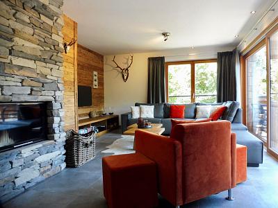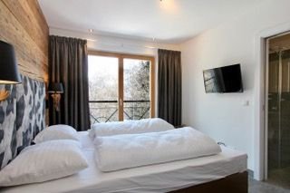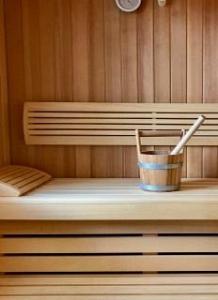 Dieses Design-Apartment in stylischer Holz-Optik hat eine eigene Sauna. Es befindet sich im 1. Stock und ist für 6 Personen geeignet. Das schöne Wohnzimmer, wo sich der Esstisch und eine Sitzecke befinden, lädt zum Entspannen ein. Vom dort gelangen Sie direkt zum Balkon, wo Sie eine wunderschöne Aussicht genießen können.