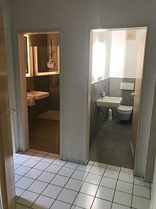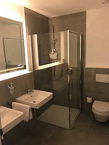 Ein Duschbad mit Toilette, Dusche, teilweise mit Gäste WC