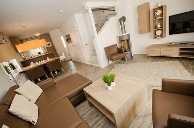 Die Ferienhäuser (78 - 86m²) sind ausgestattet für 4 bis 8 Personen, mit 2, 3 oder 4 Schlafzimmern, 2 Duschbädern und Waschmaschine.