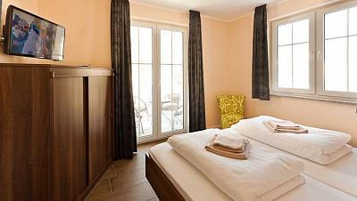 1 Schlafzimmer mit Doppelbett mit LCD-TV und Bettwäsche
