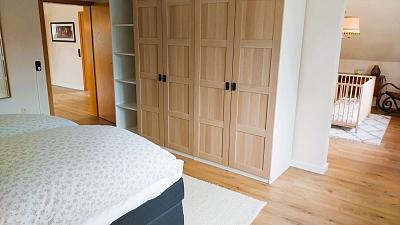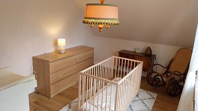 1 Schlafzimmer mit Doppelbett (140 x 200), Kleiderschrank und Babyzimmer mit Gitterbett und Wickelkommode