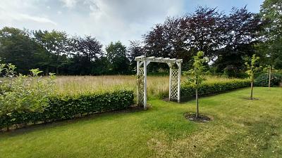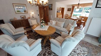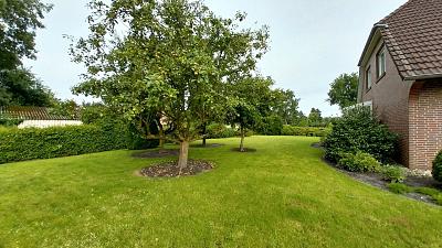 | Genießen Sie den Blick auf den gepflegten Garten und die umliegenden Bäume durch die zahlreichen Fenster. Der Garten ist mit Hecken geschützt, jedoch für erkundungsfreudige Hunde und Kleinkinder kein Hindernis das Grundstück |