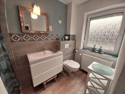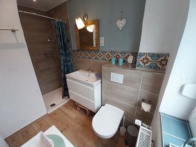 Das Badezimmer mit Dusche und WC befindet sich im Erdgeschoss, im Obergeschoss gib es zusätzlich ein Gäste-WC.