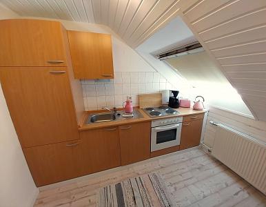 Die Unterkunft verfügt über eine kleine Diele, von der aus links eine Tür in die vollausgestattete Küche mit Essbereich führt. Sie verfügt über: Kühlschrank mit Gefrierfach - Mikrowelle - 4 Platten Kochfeld mit Backofen - Kaffeemaschine - Toaster.