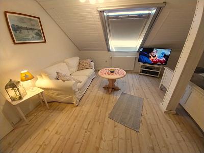 Durch eine Zwischentür gelangt man in den Wohn-Schlaf-Raum mit gemütlicher Sitze-Ecke, Fernsehen (mit Blue-Ray-Player), Stereoanlage, Kleiderschrank. Kommode und der Schlafgelegenheit (Doppelbett: 2 Matratzen 90 x 200 cm). Das W-LAN mit Gastzugang (Surfen und E-Mail) steht Ihnen kostenfrei zur Verfügung.