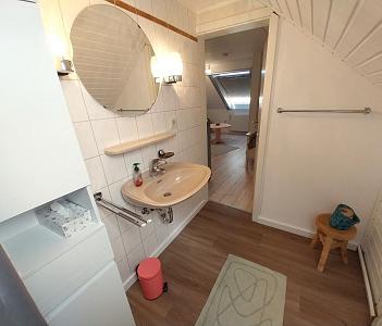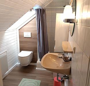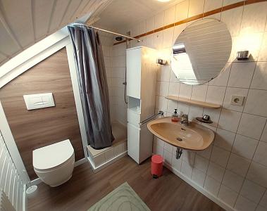 Von dort führt eine Tür in das Tageslicht-Bad mit Dusche. Ein Spiegel, ein Waschtisch sowie ein Hochschrank für die Unterbringung Ihrer persönlichen Dinge runden das Wohlgefühl im Badezimmer ab.