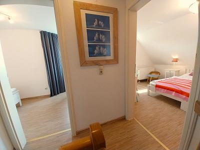 Im Obergeschoss befindet sich das Tageslicht-Bad, ein Schlafzimmer mit zwei Einzelbetten sowie ein Schlafzimmer mit Doppelbett und Zugang zum Balkon.
