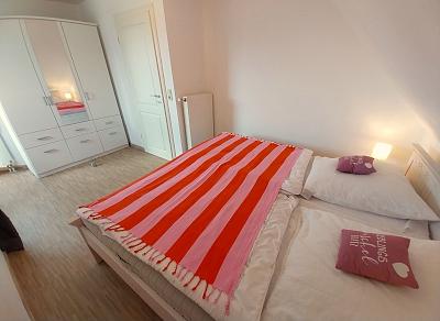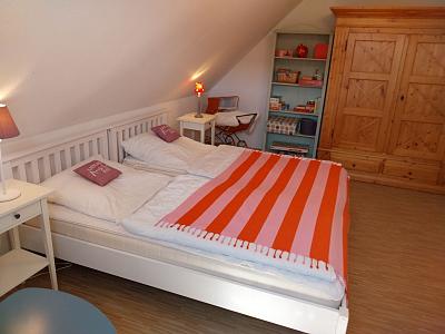 OG: 1 Schlafzimmer mit Doppelbett (180 x 200 cm), 2 Nachtkonsolen mit Nachttischlampen, Kleiderschrank, kleine Sitzecke im Erker.