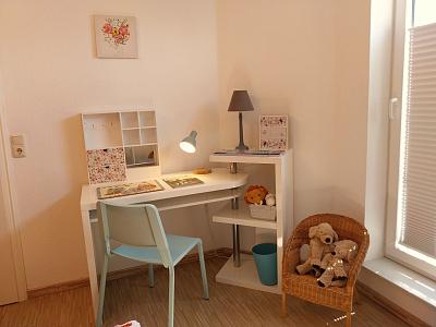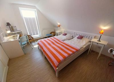 OG: 1 Schlafzimmer mit zwei Einzelbetten (je 90 x 200 cm), 2 Nachtkonsolen mit Nachttischlampe, Kleiderschrank, Regal, Schreibtisch.
