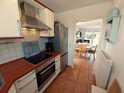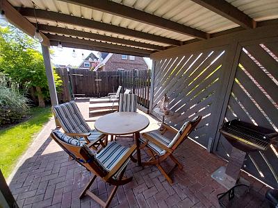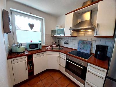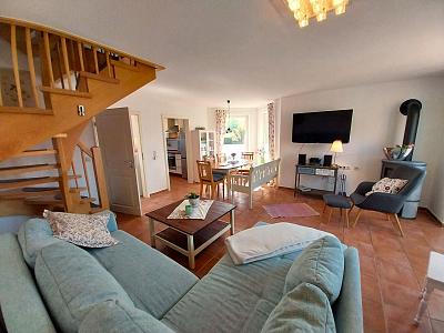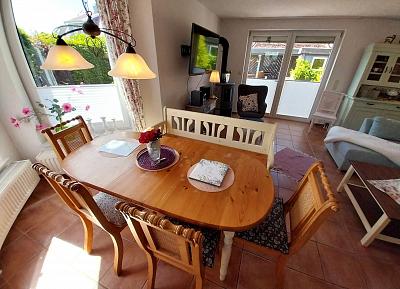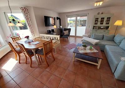 Die Unterkunft verfügt im Erdgeschoss über eine kleine Diele, von der das Gäste-WC und die Abstellkammer mit Waschmaschine abgehen. Durch eine Zwischentür gelangt man in den Wohnraum mit Einbauküche, Essgarnitur, gemütlicher Sitze-Ecke und Terrasse.