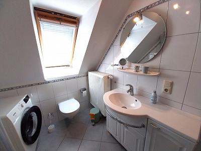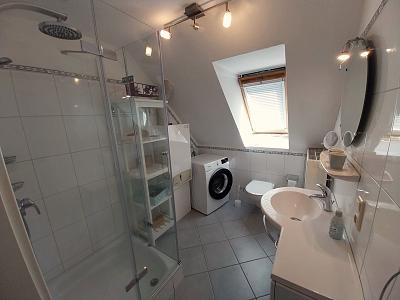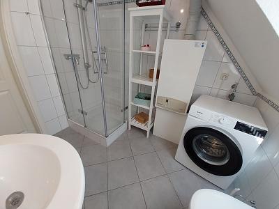 Im Tageslichtduschbad im OG befindet sich neben dem WC eine Dusche. Ein Spiegel, ein Waschtisch sowie ein Unterschrank. Ein Regal für die Unterbringung Ihrer persönlichen Dinge runden das Wohlgefühl im Badezimmer ab. Dort befindet sich auch die Waschmaschine.