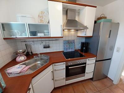 Angrenzend an das Wohnzimmer befindet sich die offene Küche und der Esstisch für bis zu 6 Personen. In der voll ausgestatteten Küche finden Sie u.a.: