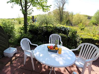 | Offene Terrasse mit Rasenstück Die Terrasse hat freien Blick ins Landschaftsschutzgebiet. Kinder können dort, noch wie Kinder, auf der Wiese rumtollen und spielen. |