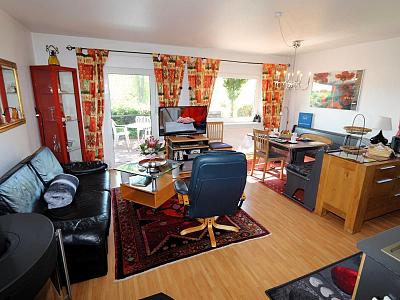 Wohnraum mit bequemer Couchgarnitur, TV, Mini-HiFi-Anlage , CD-Player und Kaminofen.