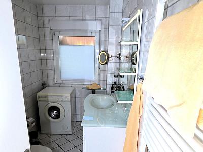 Tageslichtduschbad mit WC, Kosmetikspiegel und Waschmaschine.